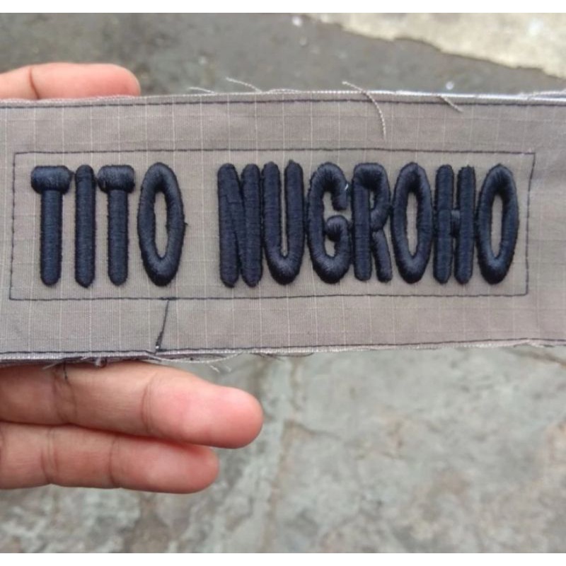 Satu set bordir nama untuk tni dan polri ukuran 15 x 4 cm bahan kain atas nagata drill bahan bawah kain kapas tebal benang rayon